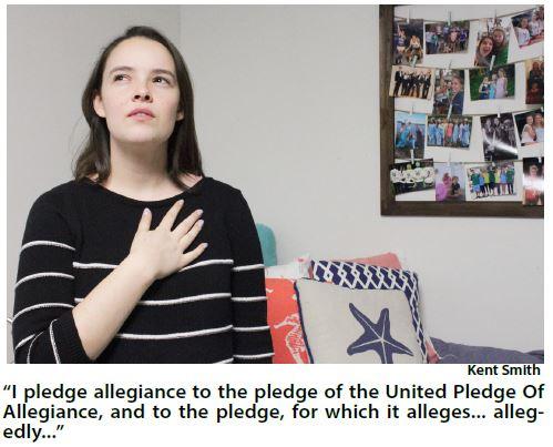 Holding coffee in one hand and placing the other over her heart, American Studies concentrator Keely Montero spent nearly six hours last night facing an American flag hung on her dorm room wall and practicing the Pledge of Allegiance by herself over and over again. “I pledge allegiance to the flag of the United States of America,” said Montero with perfect rhythm and cadence, her roommate fast asleep while she repeatedly devoted herself to her country in preparation for her upcoming midterm in AMST1450: America! Nation of Dreams. “And to the Republic for which it stands, one Nation under God, indivisible, with liberty and justice for all. Man, I love my country and my concentration!” At press time, the Pledge of Allegiance didn’t even show up on the midterm, and Montero and her classmates went to war.