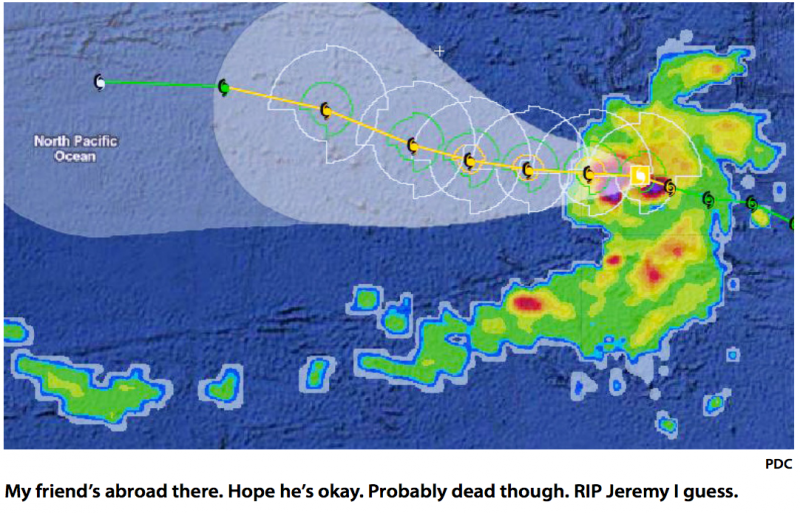 “Hurricane Justine just slammed an uninhabited part of the Pacific Ocean and it has showed no signs of letting up,” Weather Channel meteorologist Jefferson Gallworth said, adding that Justine, which occurred in the middle of the ocean and will affect literally no one, will at its height pack 145-mile-an-hour winds and water surges of up to 40 feet. “This is a mean storm.”