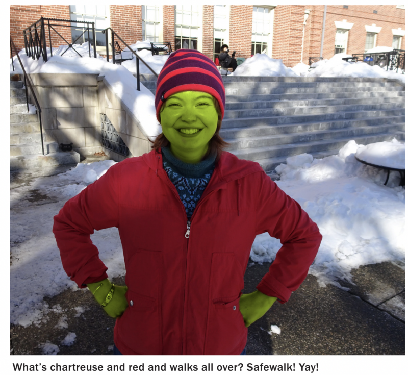 “What do I think makes me a great safewalker?” Warner-Kellog asked, body shining yellow-green as he reflected the headlights of passing cars. “Well, I’m alert, personable, and I enjoy long walks at night!”