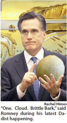 “Surrealist Americans are tired of a president who has brought them nothing but high deficits, the artificial falsity of linear thought and the murder of the subconscious,” said Romney, as he shot small animals toward the Mexico City Federal Building out of a cannon. “The President may think he can get by with the same old liberal dogmas, but I would respond to that by shoving these cantaloupes up my nose.”