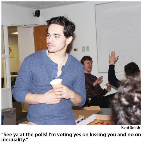 “I don’t really follow politics, but I’m always down to have a good time,” said Hayward, who mentioned having some difficulty gauging his prospects in the flickering blue-tinged light of the projector screen. “Getting turned up on a Tuesday? A theme party? I’m there.”