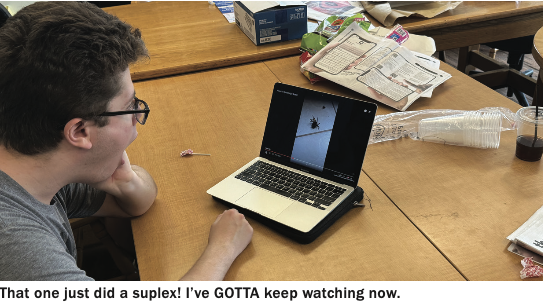 “Holy shit, that wasp is totally getting its ass kicked by that big spider,” said Altman ’25 at 10:34pm, whose midterm was due at 11:59pm. “Oh my god, it just picked up the wasp like a WWE finisher.”