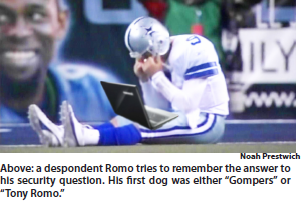 “Well fuck,” Romo said, turning on his laptop and watching a replay of an interception he himself threw 30 seconds earlier. “He did it again. Just like I said, the guy can barely concentrate.”